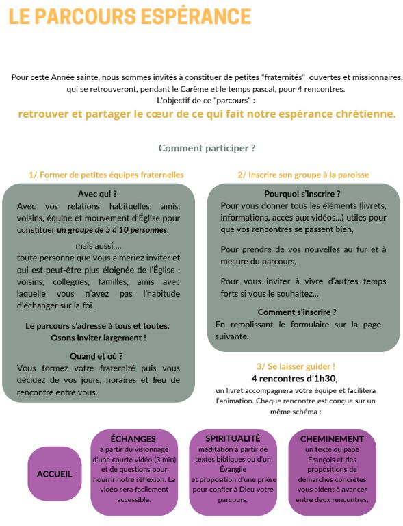 Pour faciliter l’animation des Fraternités et vivre ce parcours, un livret personnel sera disponible pour chaque participant. Pour ceux qui le souhaitent, ce « guide » est accessible au format numérique sur le site du diocèse : parcoursespereance.diocese-saintetienne.fr